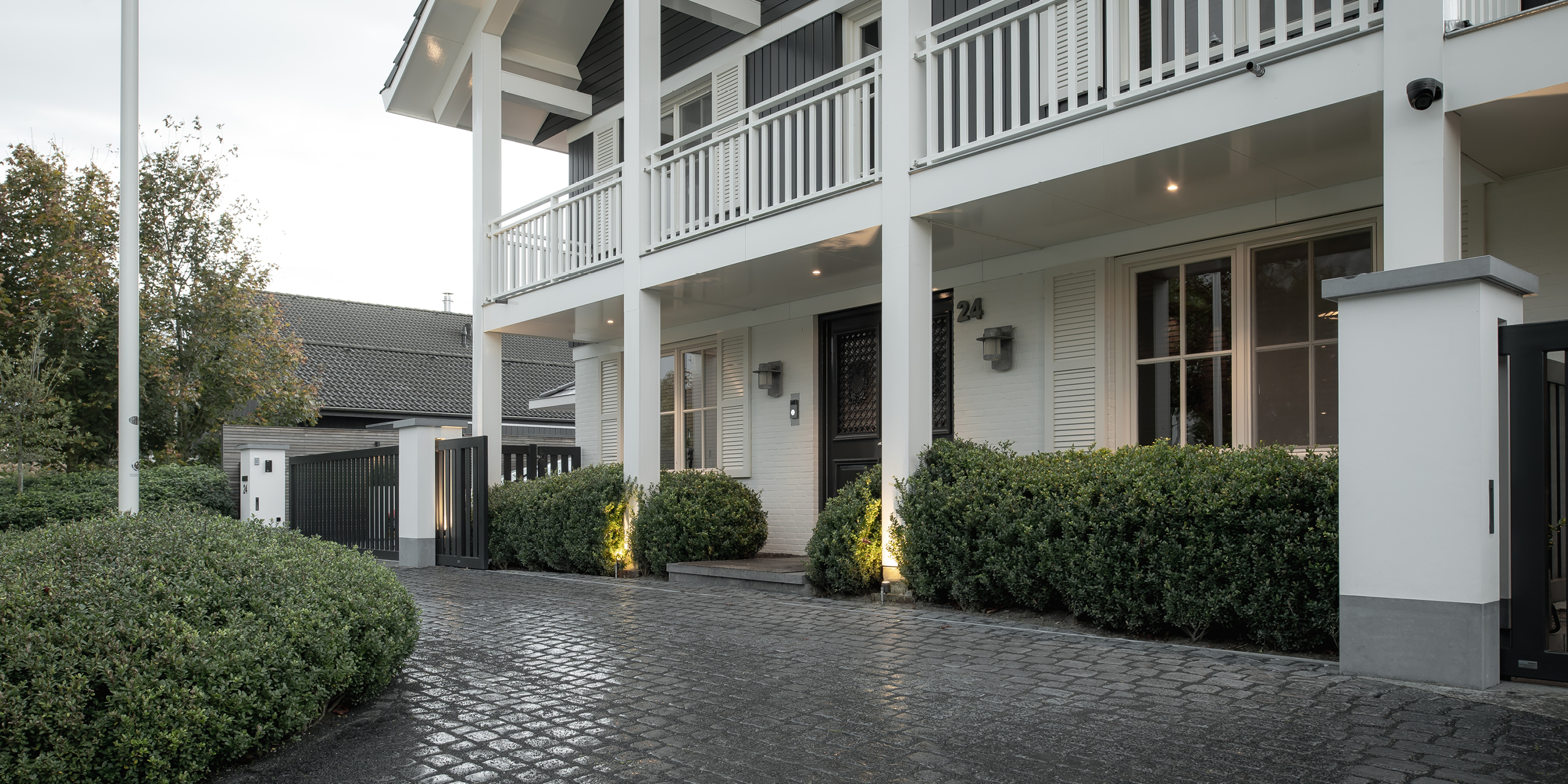 Deze unieke en ruime woning is te vinden in het hoge Noorden van ons land. Aan de achterzijde ligt de tuin aan het water, met een adembenemend uitzicht. De opdrachtgevers wensten een onderhoudsvriendelijke leeftuin die rust uitstraalt en tevens stijlvol is. Ook een onopvallend voetbalveldje, dat er toch echt bij hoort. Daarbij was een zwembad gewenst, met verschillende terrassen en een goede aansluiting op het water. Het voetbalveld is een blikvanger geworden, dat dienstdoet als panna-veldje. Het zwembad is van uitzonderlijke klasse en heeft een in hoogte verstelbare bodem. Het is zowel veilig als zuinig: deze bodem houdt het water op temperatuur en kan ook nog eens dienst doen als terras. Er zijn diverse zitplekken in de tuin, inclusief een veranda die uitkijkt op het water. Deze tevens kindvriendelijke tuin is van zeldzame allure.
